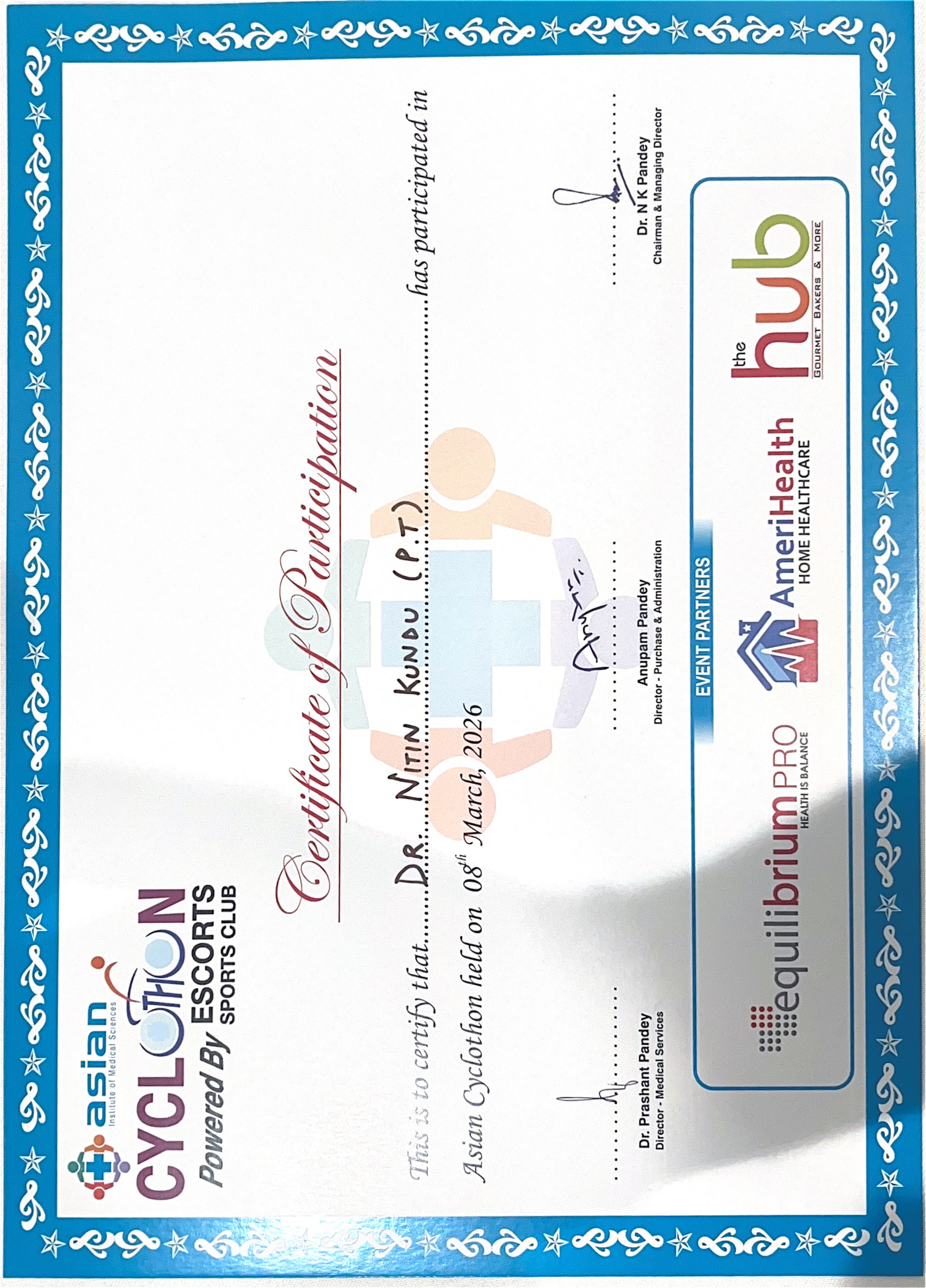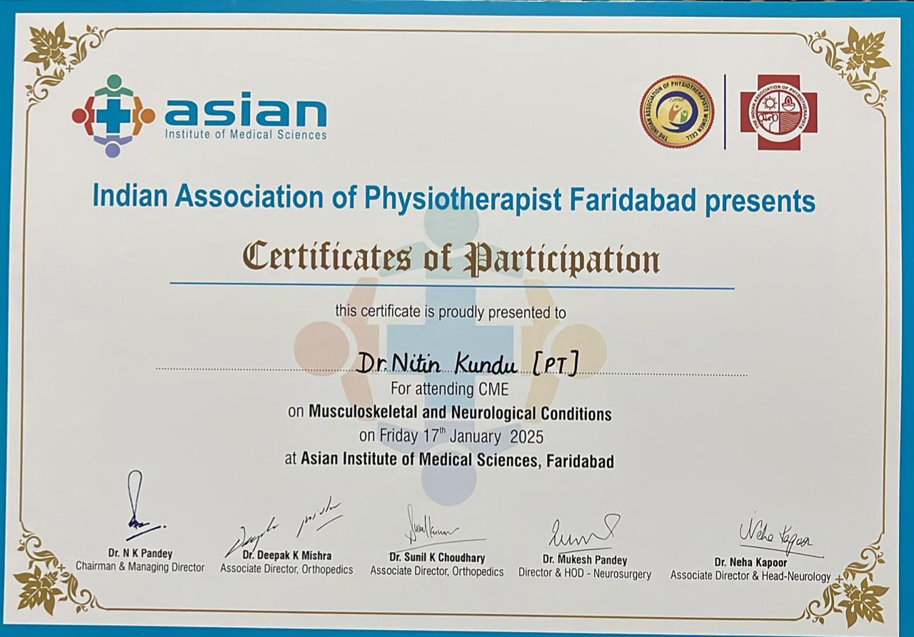 Dr. Nitin Kundu (P.T), BPT, MPT (Neurology), is a highly skilled and experienced Consultant Physiotherapist at the Asian Institute of Medical Sciences, dedicated to helping patients regain strength, mobility, and independence. With a deep understanding of Neurological Rehabilitation and Neuro Physiotherapy care, Dr. Kundu provides comprehensive rehabilitation for conditions such as stroke, Parkinson’s disease, spinal cord injuries, traumatic brain injury, Multiple Sclerosis, and Neuropathy. His patient-focused approach emphasizes recovery, confidence, and long-term well-being, helping individuals lead more active and fulfilling lives.